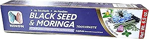 Ninon Fluoride-Free, Paraben-Free, Saccharin-Free Black Seed & Moringa Toothpaste Offers Combined Benefits For Healthy Teeth and Gums. INGREDIENTS: Black Seed, Moringa, Coconut Oil, Aloe Vera, Rose Hip, Tumeric, Grapefruit, Ginger, Lemon, Sea Salt, Myrrh Gum, Peppermint, Lavender, Tea Tree Oil, Spearmint, Propolis, Resin, Sorbitol, Silica, Glycerin, Xylitol, Saffron, Fennel Seed, Babool, Cinnamon, Licorice, Olive Oil, Miswak, Natural Flavour, D.M. Water, Sodium Bicarbonate (Baking Soda), Sodium Benzoate, Sodium Carboxymethyl Cellulose.