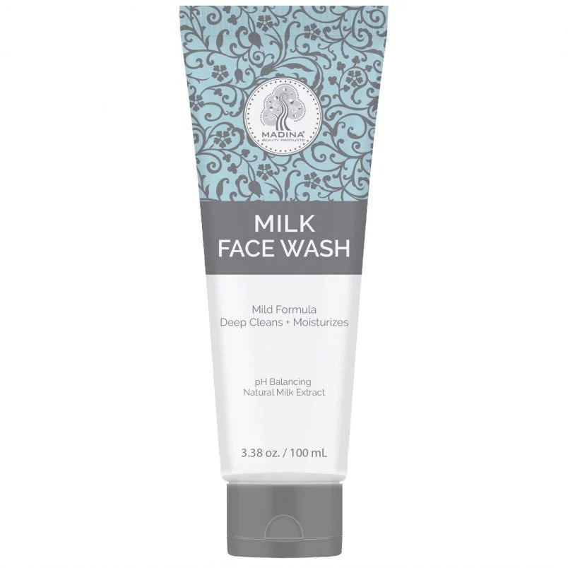 MADINA MILK FACE WASH deep cleans by gently removing makeup and impurities. Hydrolyzed Milk Protein moisturizes, nourishes and protects against drying leaving skin feeling soft, supple, and radiant. Gentle enough for even the most sensitive skin, this ultra-nourishing formula is infused with soothing aloe vera, Vitamin E and chamomile designed to leave skin feeling clean and refreshed. DIRECTIONS: Wet face with lukewarm water. Apply cleanser to face and neck with a gentle, circular motion. Rinse with lukewarm water and pat dry. Use morning and evening INGREDIENTS: Aqua, Potassium Stearate, Potassium Myristate, Potassium Laurate, Glycerin, Cocamidopropyl Betaine, Cocamide MEA, Milk Extract, Fragrance, Triethanolamine, Methylisothiazolinone,